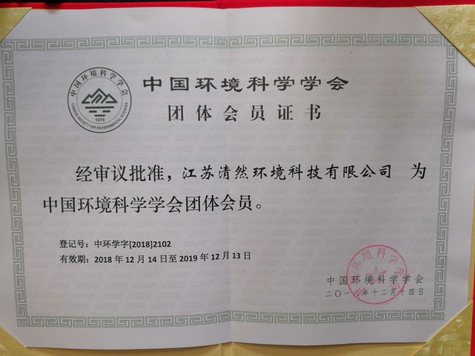 中国环境科学学会团体会员证书:中环学字[2018]2102